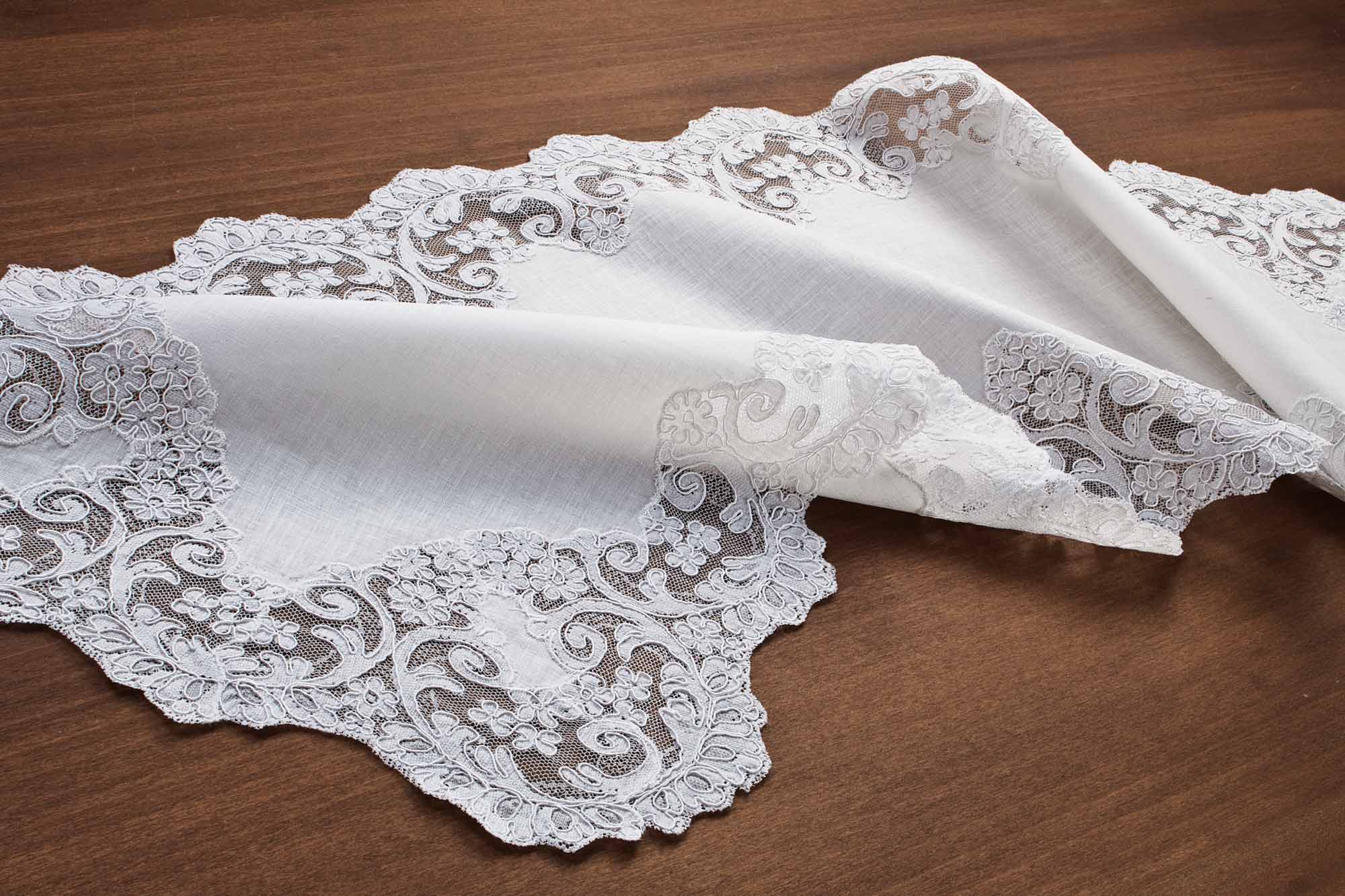 Centri e strisce in puro lino. Una serie di centri e strisce ricamati, raffinati ed eleganti, con inserti e bordi in pizzo rebrodè, color bianco-latte. Disponibili il CENTRO nella misura rettangolare da cm 32×48 oppure la STRISCIA da cm 40×120.